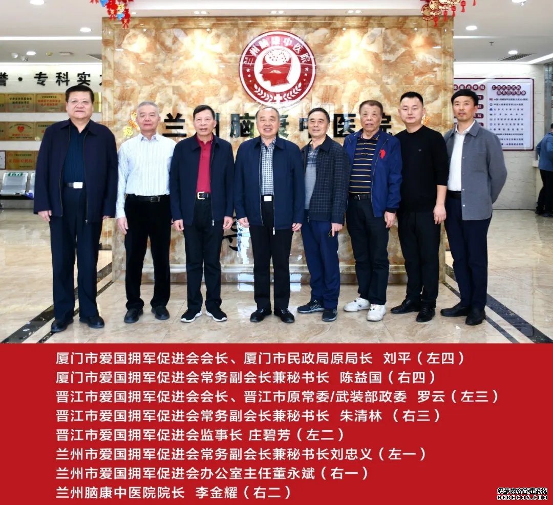 在兰州市爱国拥军促进会常务副会长兼秘书长刘忠义、办公室主任董永斌陪同下,福建省厦门市爱国拥军促进会会长刘平、常务副会长兼秘书长陈益国、晋江市爱国拥军促进会会长罗云、常务副会长兼秘书长朱清林、监事长庄碧芳,莅临兰州脑康中医院进行参观,开展深入的调研指导,全面了解我院重点专科建设、脑病学科发展、拥军惠军医疗服务事业的发展等服务工作开展调研、走访。